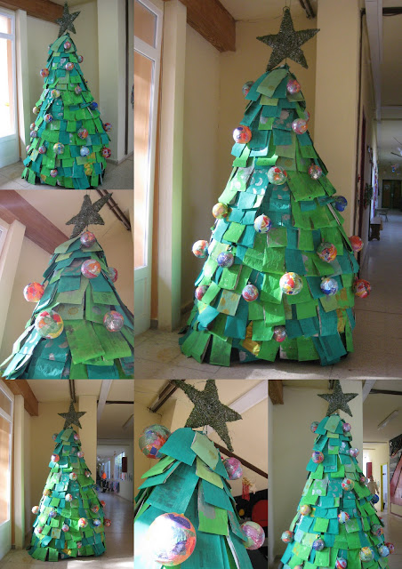 I així és com ha quedat el nostre arbre de Nadal a l'Escola. Tot infantil vàrem pintar les fulles de diaris vells de l'escola amb diferents tècniques i diferents verds: estampant, amb purpurina, amb rodets, etc. I 5 anys vàrem realitzar les bolles.