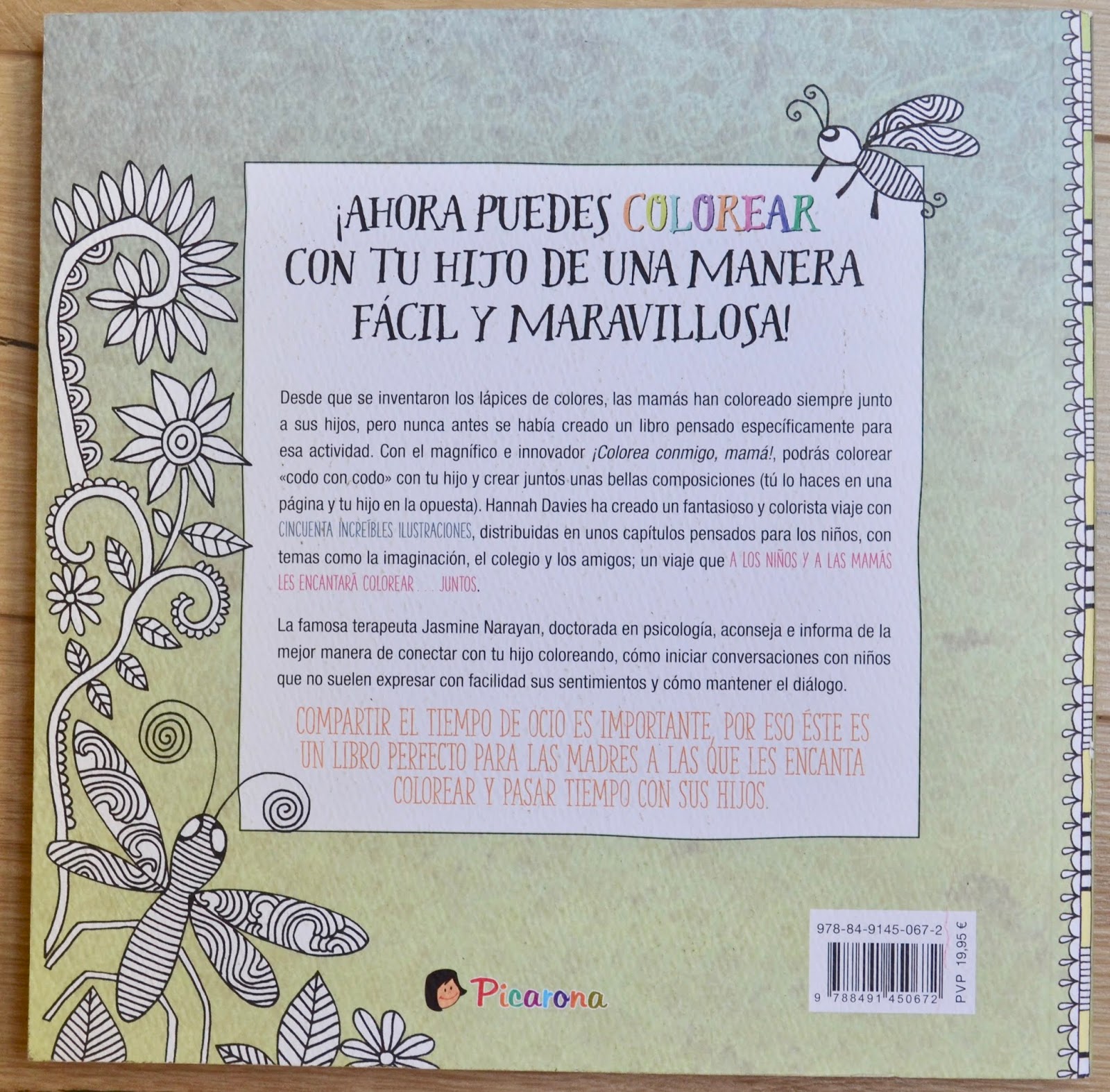 Un dia d'aquest estiu, sense fer-ne comptes, vaig trobar aquest llibre a una llibreria. Tot i que el títol sigui: ¡Colorea conmigo, Mamá! de l'editorial Picarona. (Picau la imatge) Està dirigit tant a mares com a pares. Ja només de fullejar-ho em va cridar molt l'atenció dues coses: les il·lustracions i el sobretítol "Crea, colorea y estrecha vínculos con tu hijo".