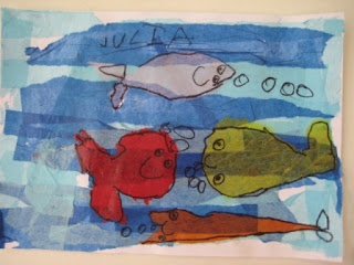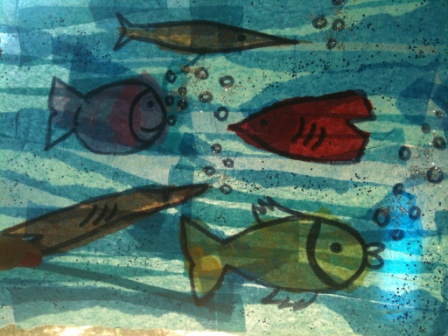 Aquest és el prototip que vaig fer jo, per fer proves, per fer la portada de l'àlbum del tercer trimestre. A la foto no s'aprecia molt bé, però queda xulíssima. S'aferra a un acetato o film de cuina primer els peixos de paper de seda de colors i per damunt el paper de seda blau. Tot ben encolat amb cola blanca aigualida. Quan està aixut es retira el paper de plàstic acetato o film de cuina i queda tot el collage ben incrustadet i finet, amb una textura molt mona... Deprés amb retus es perfilen els peixets i es fan les bombolles.