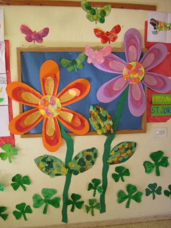 Aquests tallers els vàrem fer uns altres anys, són flors gegants per decorar el passadís. La tulipa està feta de cartró. Les Margarides estan fetes de superposició de papers (cartolina i seda). Si vos fixau hi ha penjades unes papallones que les vàrem fer de paper de seda encolades dins "acetatos".