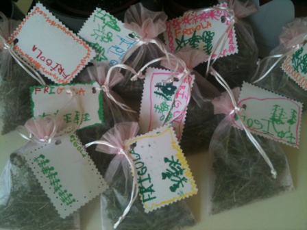 Bossetes de frígola (planta aromàtica de Formentera, que vendria a ser "tomillo"), que vàrem fer pel Centre d'Interès de les Plantes. És un taller molt fàcil però els hi va encantar "esmicolar" sa frígola i ficar-la dins bossetes. Cada dia veus algun cotxe per Formentera que dur aquesta bosseta al retrovisor.
