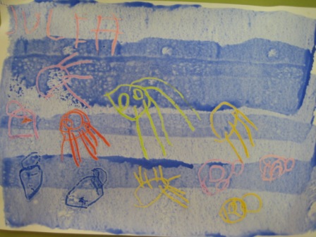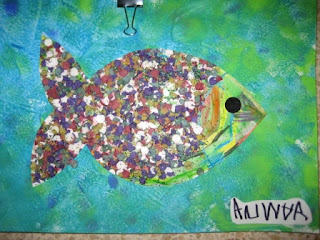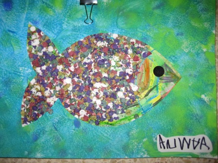 Peix confeccionat amb paperí amb molta cola sobre un fons de témpera molt aigualida amb rodets.