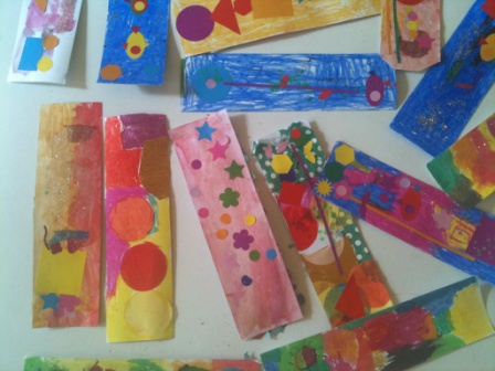 Aquests són els punts de llibre de Sant Jordi que vàrem fer aquest any (el passat divendres, més concretament). El que vàrem fer és tècnica lliure però organitzada. Vàrem disposar diferents materials per taules (ceres, retoladors, aquarel·les, papers, cola, purpurina, gomets, etc.) i vàrem deixar que els infants triessin on volien anar i que fessin el punt de llibre com volguessin! Tenen 4 anys i els va quedar xul·líssims!!!