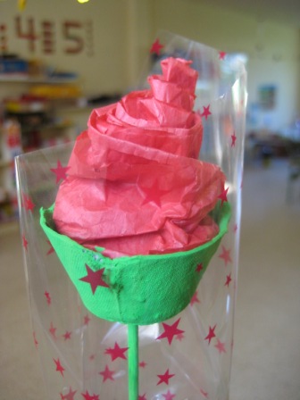 Aquesta és la rosa de Sant Jordi que varen fer a les classes de 3 anys amb oueres i paper de seda.