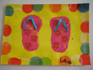 Aquesta és una portada que vàrem fer amb els alumnes de 5 anys per final de curs. És una de les meves preferides (per no dir la que més!). Vàrem estampar les soles de les xancles amb esponja i les varen decorar amb témpera. Després encolàrem amb confeti gros el marc de la cartolina. És un Din-A4. A què és xulísima?