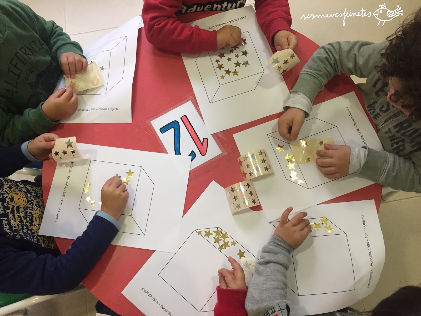 9. MINI ACTIVITAT PLÀSTICA: Els hi vaig donar un full on hi havia un cub, a més del nom de l'obra, autor i any. Els infants hi havien d'aferrar dins gomets d'estrelletes brillants. És una activitat molt senzilleta però per infants de 3 anys al primer trimestre trob que està molt bé; i ja sabeu com els hi encanten els gomets d'estrella brillants!!! Si la tornés a fer, hagués preparat la feina a un suport de full obscur o com el fons de l'obra (degradat) i crec que hagués quedat més nadalenc.